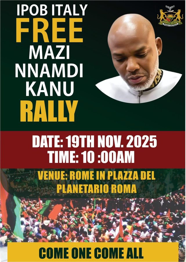 The Indigenous People of Biafra (IPOB) are set to hold a rally demanding the release of Nnamdi Kanu in Rome, Italy, as the day set aside for his judgment draws closer.
