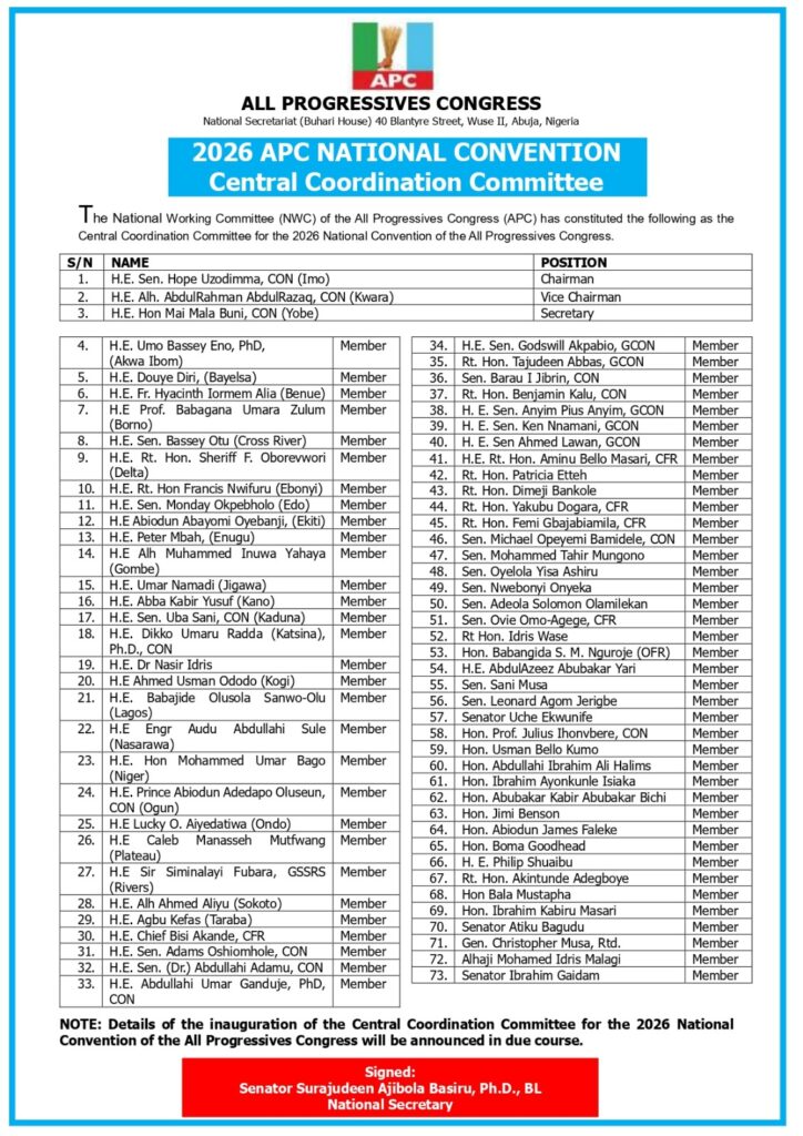The National Working Committee of the APC, in a memo signed by its National Secretary, Senator Surajudeen Ajibola Basiru, revealed that Uzodimma will chair the 73 man committe tasked with organising the party’s 2026 national convention.